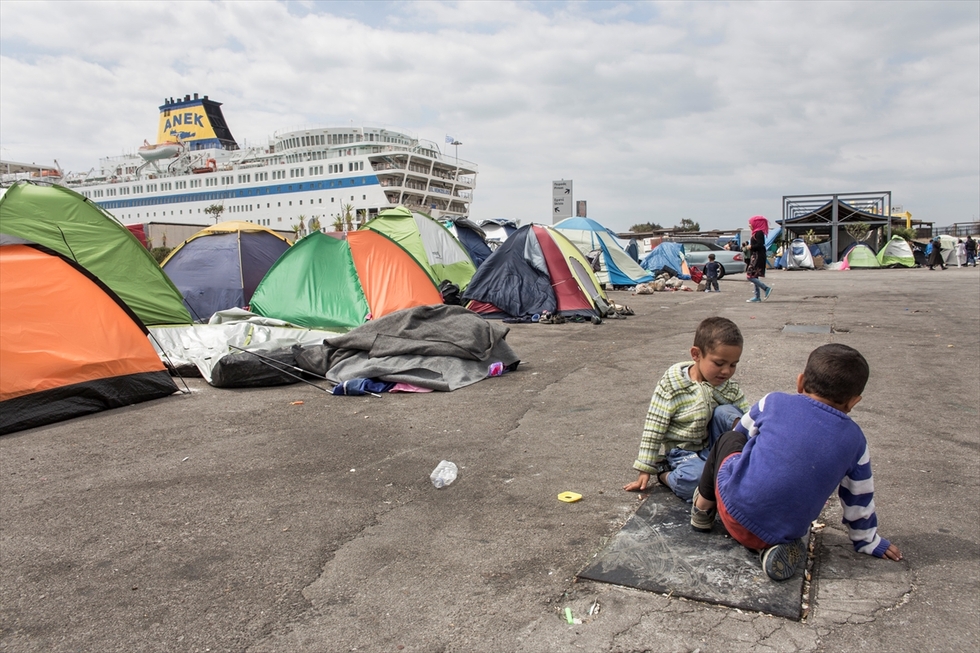 Photo: Refugee children play in front of tents in Piraeus port in Athens, Greece on 21 April, 2016 (AA).