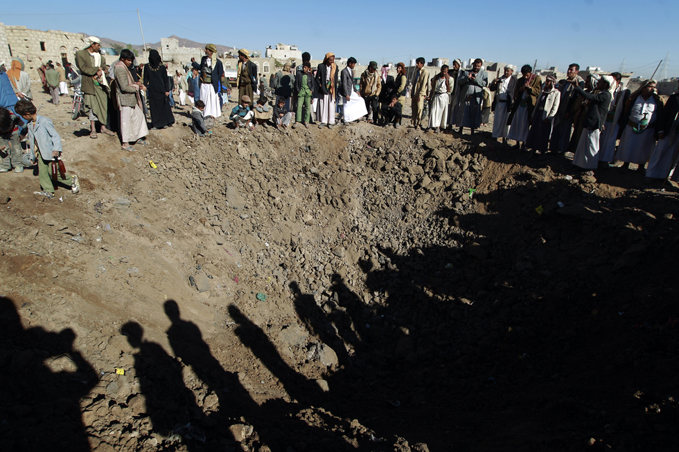 Photo: Yemenis stand around the top of a bomb crater after a Saudi air strike on the Yemeni capital of Sanaa (AFP/WAM)