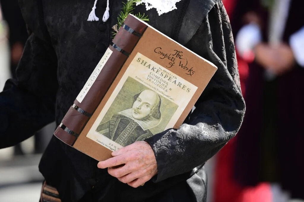 A man carries a volume of Shakespeare’s complete works in central England in 2016 (AFP)