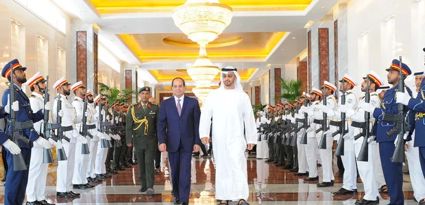 Abu Dhabi Crown Prince and Deputy Supreme Commander of the UAE Armed Forces Mohammed bin Zayed al-Nahyan (C-R) bidding farewell to Egyptian President Abdel Fattah al-Sisi following their meeting in Abu Dhabi on May 4, 2017 (AFP)