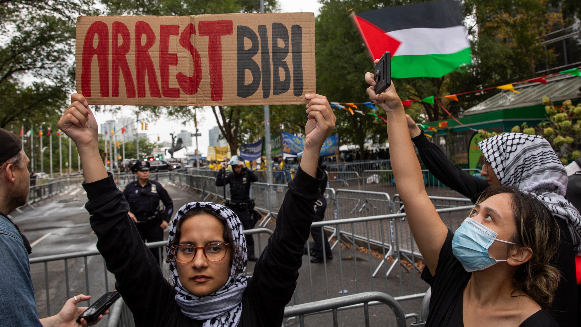A pro-Palestinian demonstrator shows a sign with the words ''Arrest Bibi'' during a protest in front of the United Nations (UN) headquarters in New York City, USA, on 26 September 2024 (Aashish Kiphayet via Reuters)