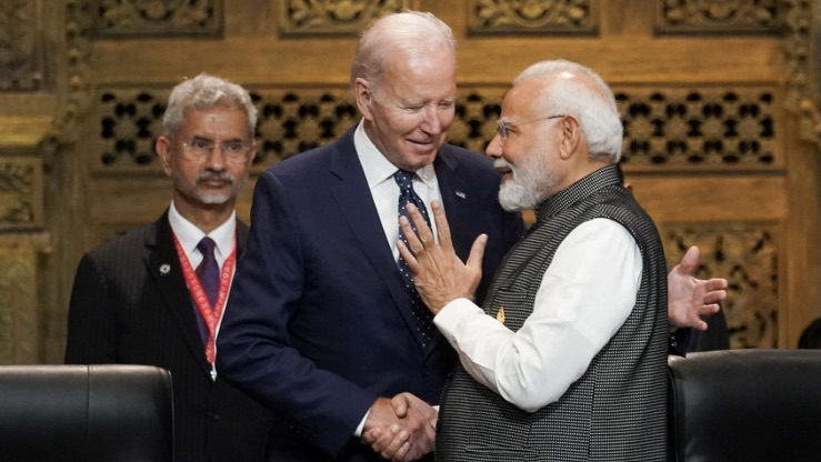 India's Prime Minister Narendra Modi (R) with US President Joe Biden (C) as India's Foreign Minister Subrahmanyam Jaishankar looks on at the G20 leaders' summit in Bali on 15 November 2022 (AFP)