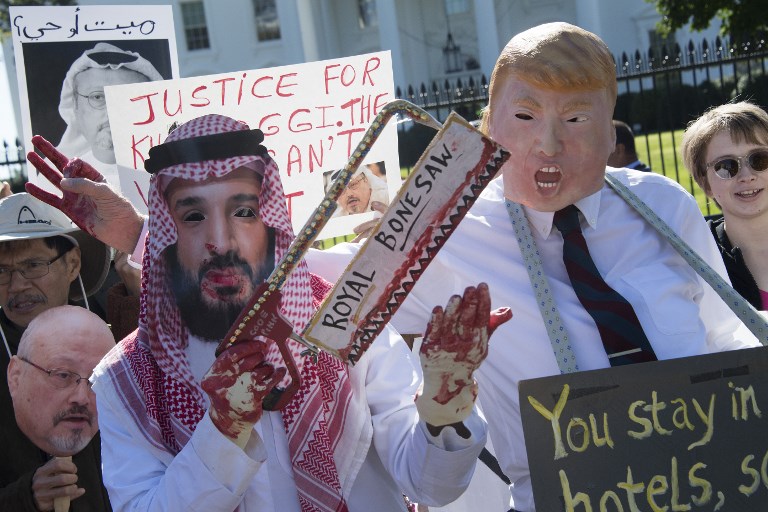 Photo: Demonstrators dressed as Saudi Crown Prince Mohammed bin Salman and US President Donald Trump protest outside the White House in Washington on 19 October 2018, demanding justice for missing Saudi journalist Jamal Khashoggi (AFP)