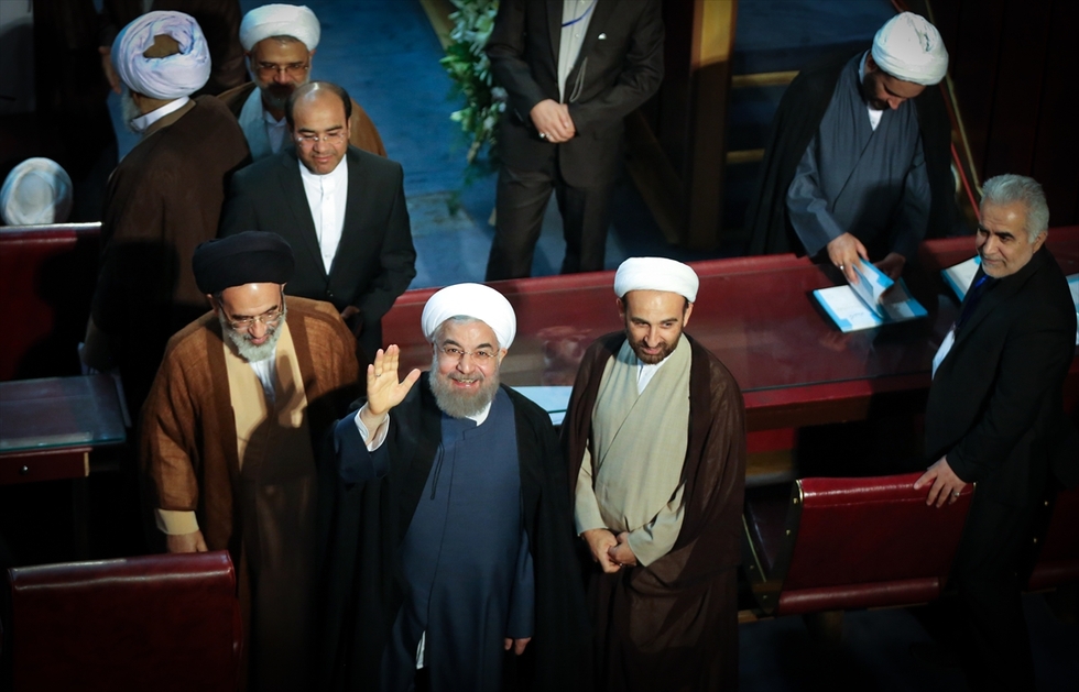 Photo: Iranian President Hassan Rouhani (C) salutes during an opening ceremony of fifth Assembly of Experts meeting in Tehran, on 24 May 2016 (AA).