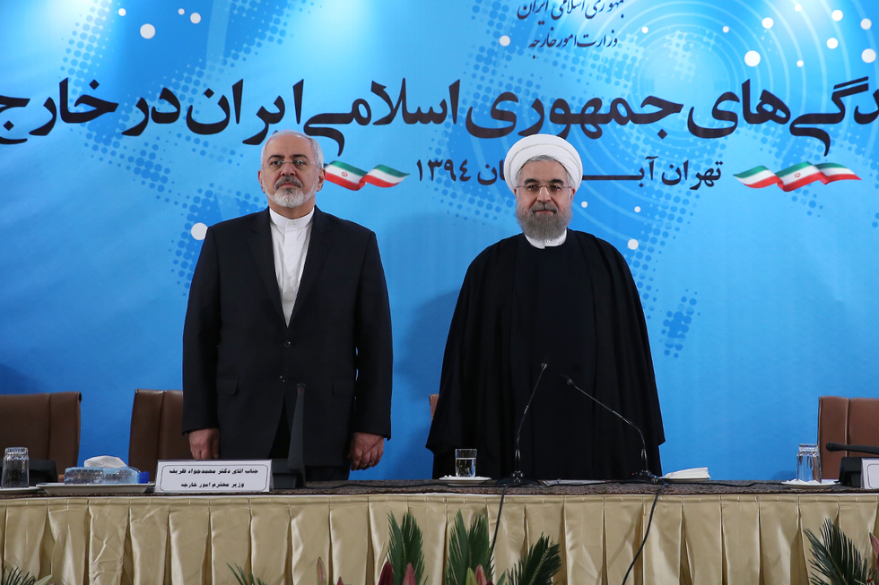 Photo: A handout photo provided by the office of Iranian President Hassan Rouhani (R) shows him next to his Foreign Minister Mohammad Javad Zarif (L) while they listen to Iran's national anthem during a meeting with foreign ambassadors and other diplomats in Tehran on 2 November, 2015 (AFP/HO/IRANIAN PRESIDENCY).