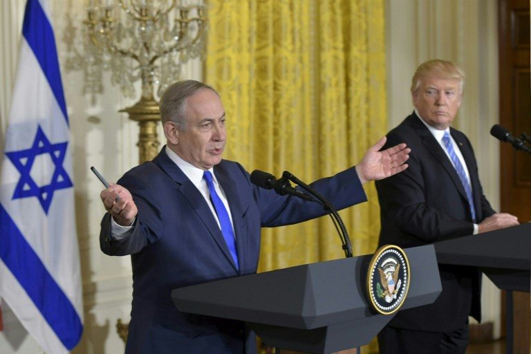 Photo: Israeli Prime Minister Benjamin Netanyahu makes a point during a joint press conference with US President Donald Trump in the East Room of the White House in Washington, DC, 15 February 2017 (AFP)