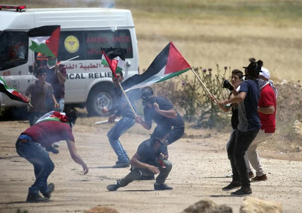 Palestinian demonstrators run for cover during clashes with Israeli forces in the West Bank village of Bait Djan, near the city of Nablus, on 19 May 2017 (AFP)