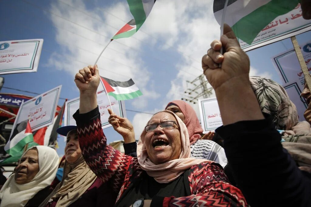 Palestinian women protest against Israel’s annexation plan in northern Gaza on 6 July (AFP)