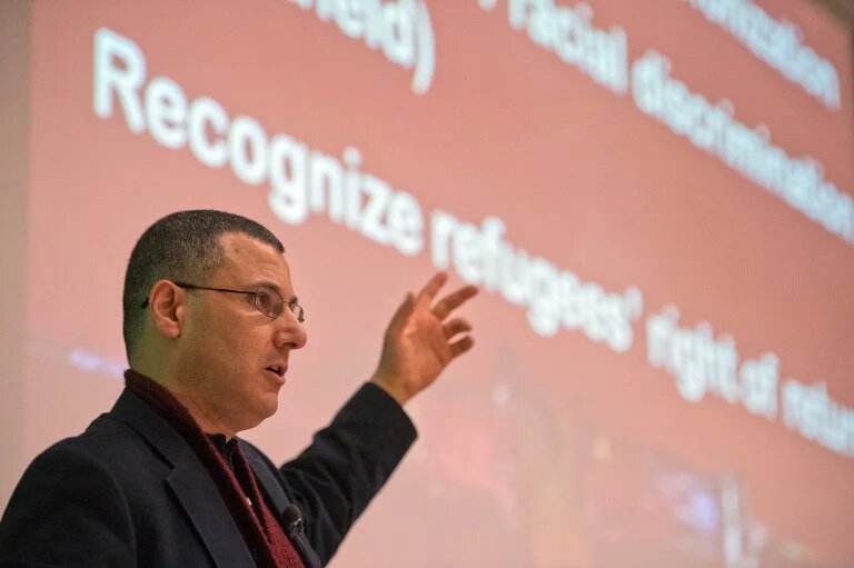 Photo: Palestinian researcher, commentator, and human rights activist Omar Barghouti speaks during a conference at the ULB university in Brussels, on 30 April 2013 (AFP)