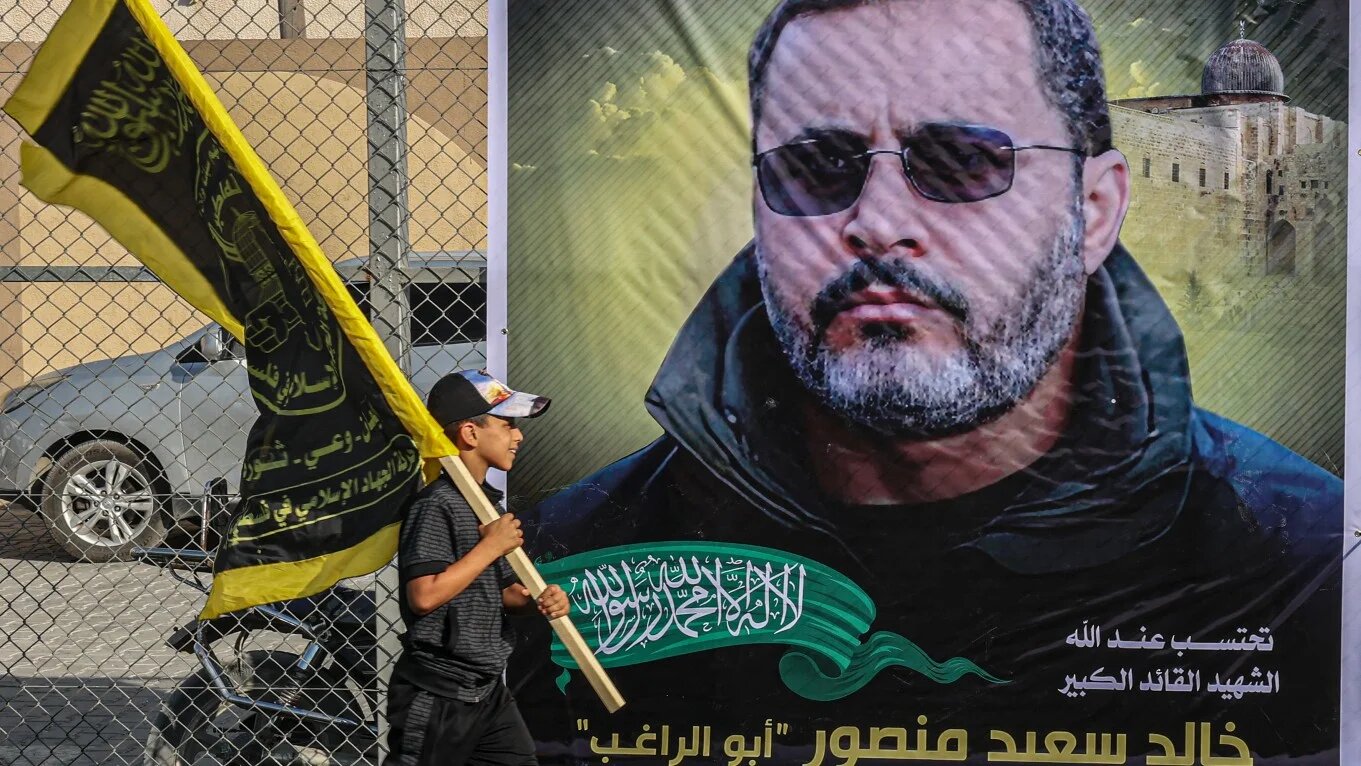 A Palestinian boy holding an Islamic Jihad flag passes a picture of the group's leader, Khaled Mansour, who was killed by an Israeli air strike on 8 August 2022 (AFP)
