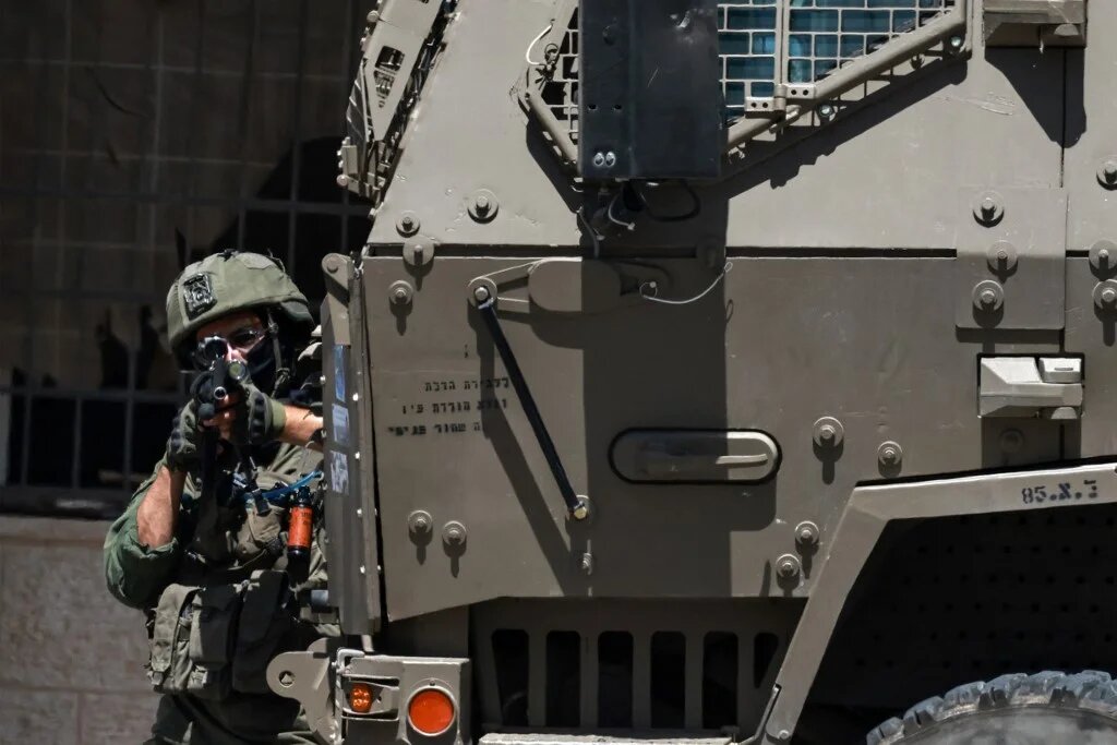 An Israeli army soldier aims his rifle during a raid on a currency exchange shop in Ramallah, in the occupied West Bank on 27 May (Zain Jaafar/AFP)
