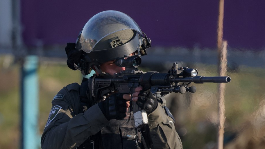 An Israeli soldier points his rifle towards Palestinian protesters near the Jewish settlement of Beit El in the occupied West Bank on 26 January 2023 (AFP)