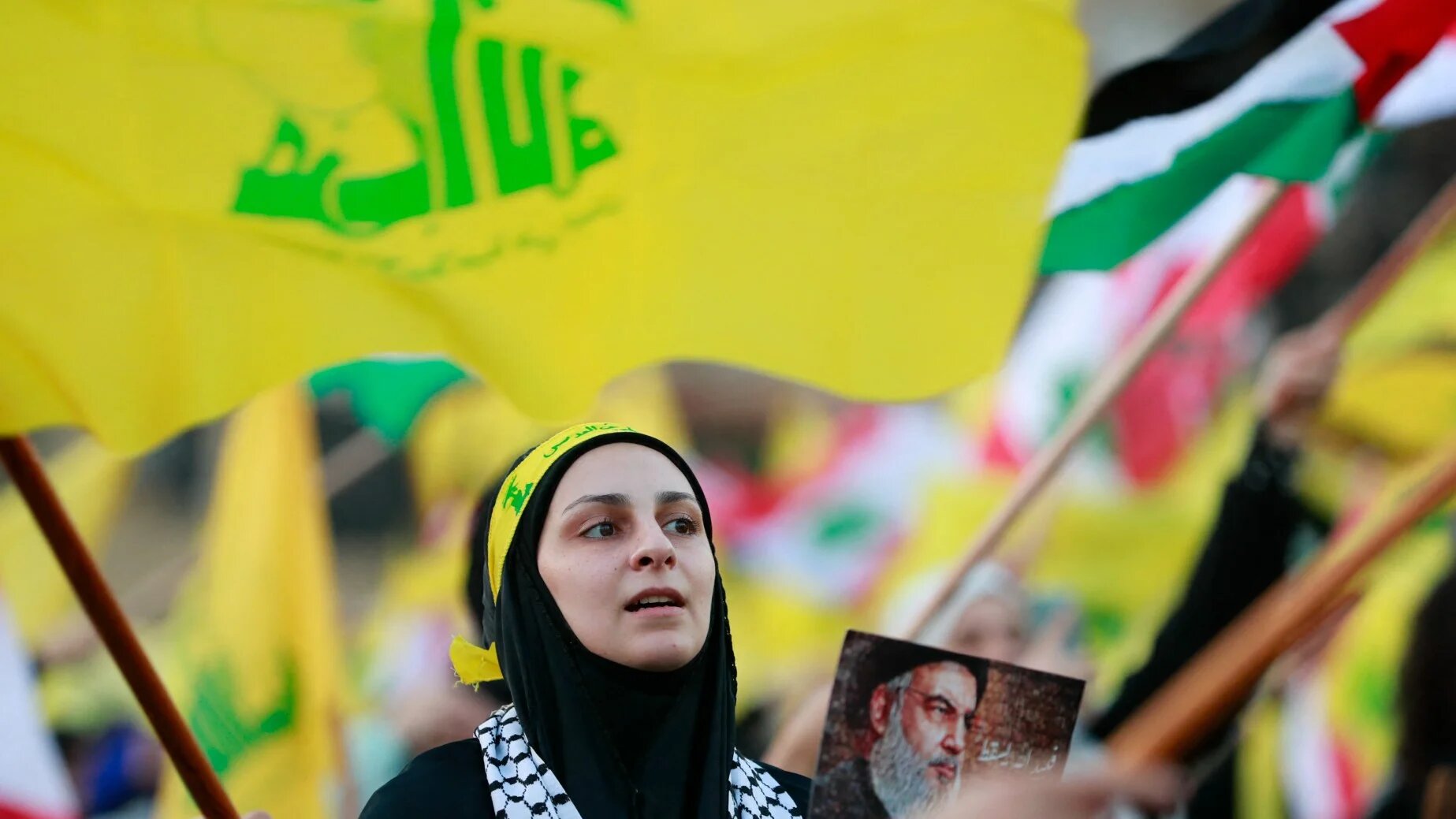 Supporters of the Lebanese movement Hezbollah wave Lebanese and Palestinian flags as they watch a televised speech by its leader Hassan Nasrallah on 3 November, 2023 (AFP)