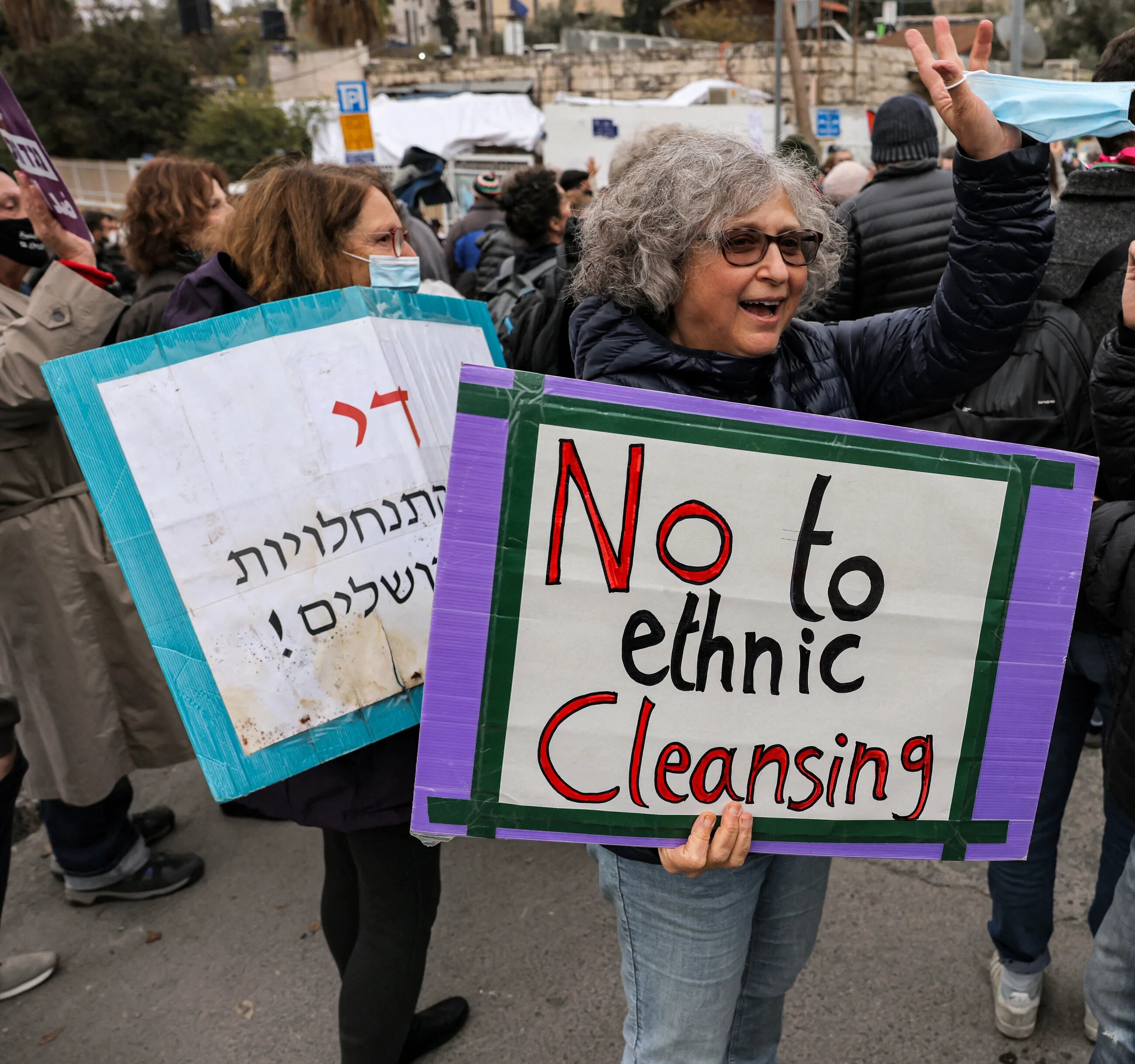 Palestinian, Israeli, and foreign activists demonstrate in the east Jerusalem neighbourhood of Sheikh Jarrah, on 31 December, 2021 (AFP)