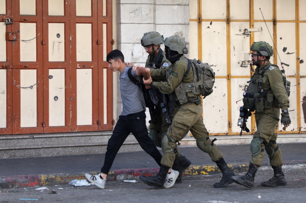 Israeli soldiers detain a Palestinian protester in Hebron on 29 September 2022 (AFP)