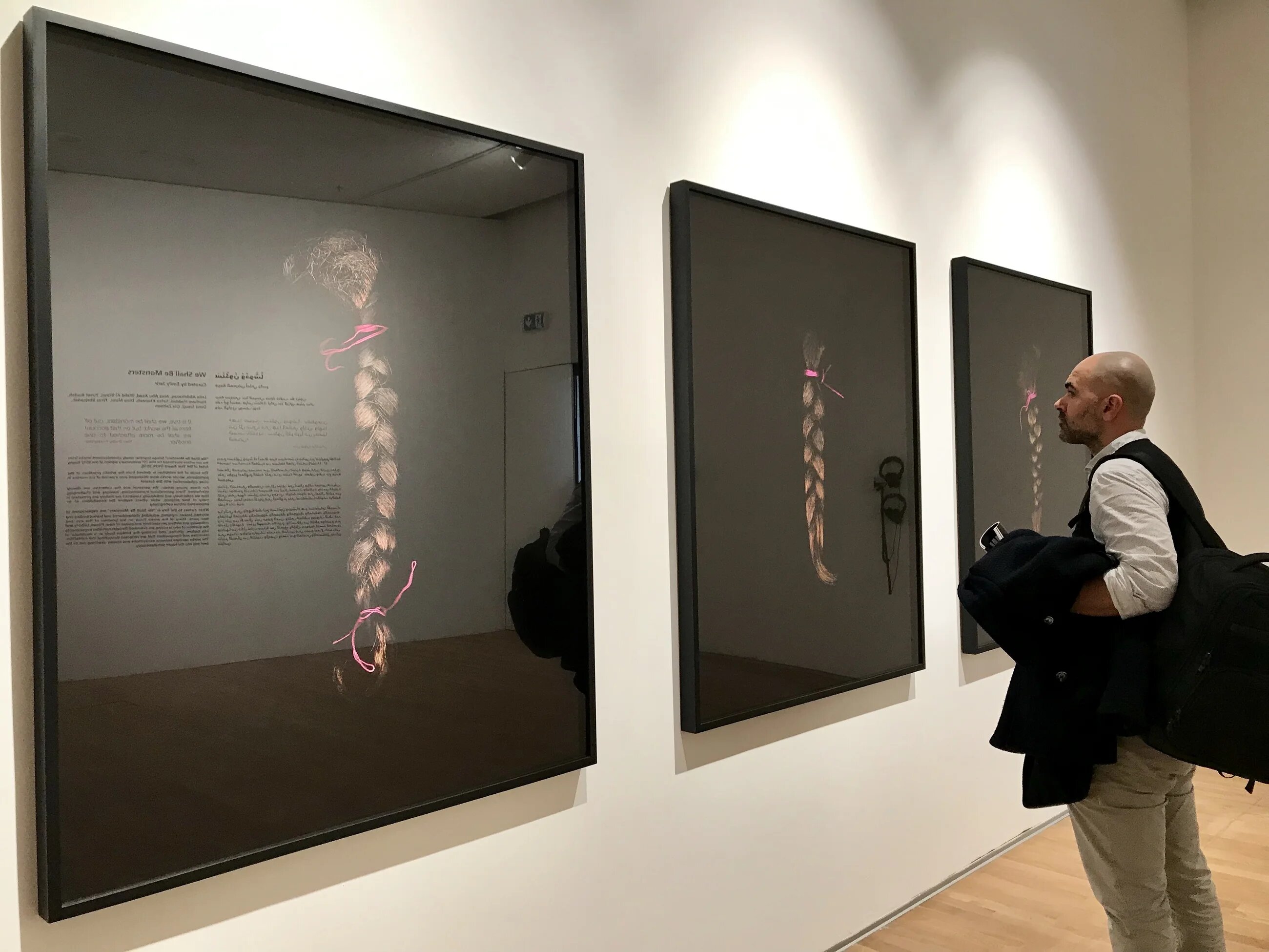 After long consideration, I decided to photograph the braids and develop the images in a dark room I set up in my home in the village of Kafr Kanna, using a scanner at the highest resolution possible. I then showcased three of the braids in large black frames to shock the viewer through its magnification.