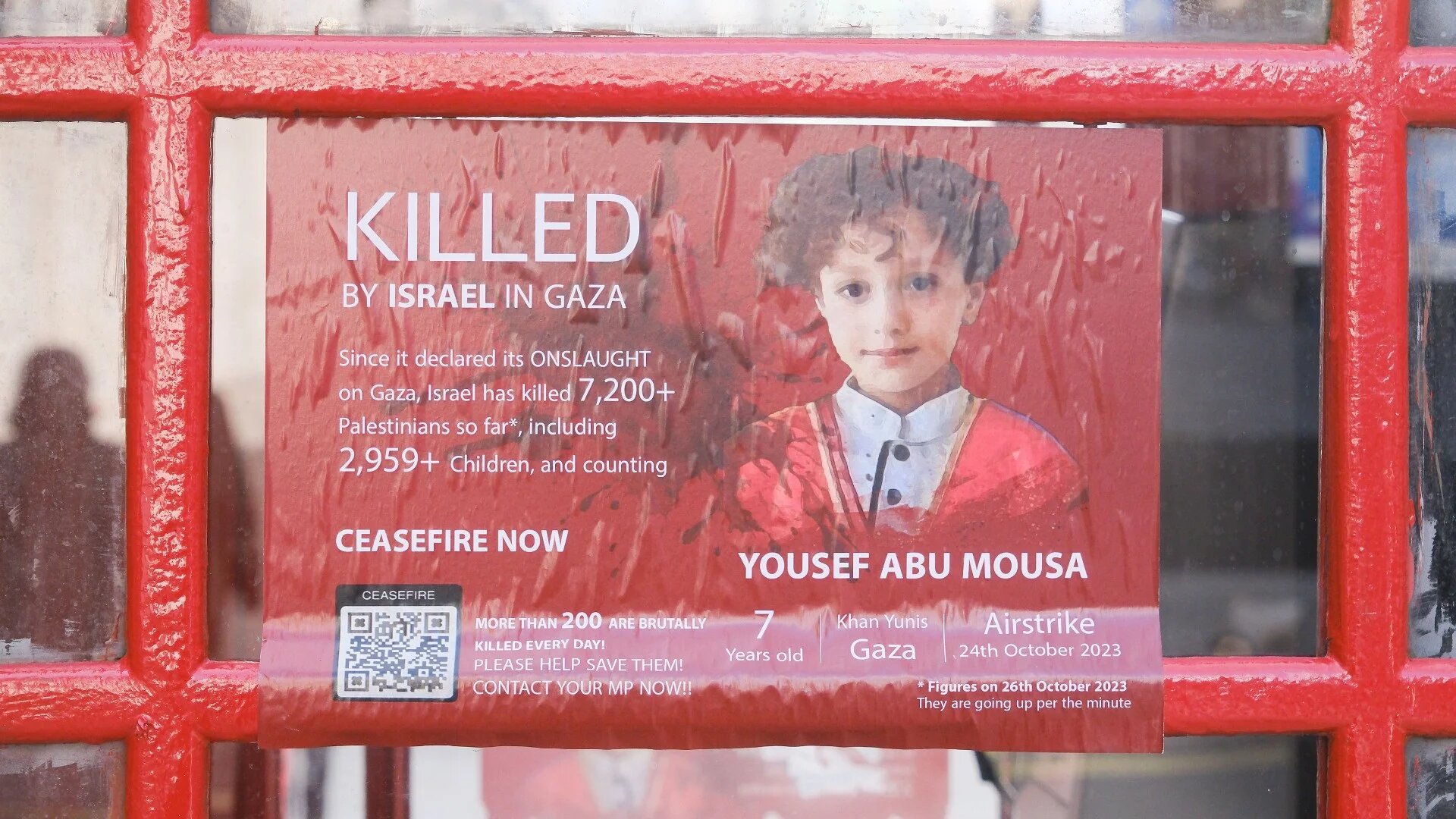 A poster of 7-year old Yousef Abu Mousa, a Palestinian child killed by Israeli airstrikes in Gaza placed in Piccadilly Circus, London on 31 October 2023 (Reuters)