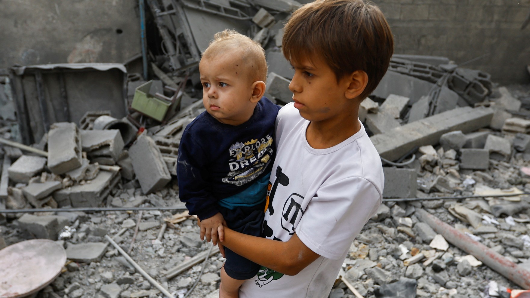 Palestinian children standing amid rubble look on during a search for casualties in the aftermath of Israeli strikes on houses, in Khan Younis, in the southern Gaza Strip, on 25 October, 2023 (Reuters)