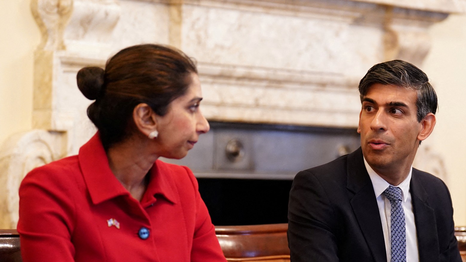 Home Secretary Suella Braverman with Prime Minister Rishi Sunak as he hosts a policing roundtable at 10 Downing Street, London, on 12 October 2023 (Reuters)