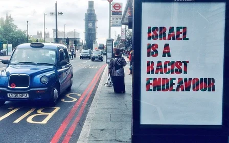 Hundreds of bus stops feature posters with an Israeli flag on one side and a Palestinian flag on the other. The captions are unequivocal: 'Us, the Hebrew city, or them, the PLO'