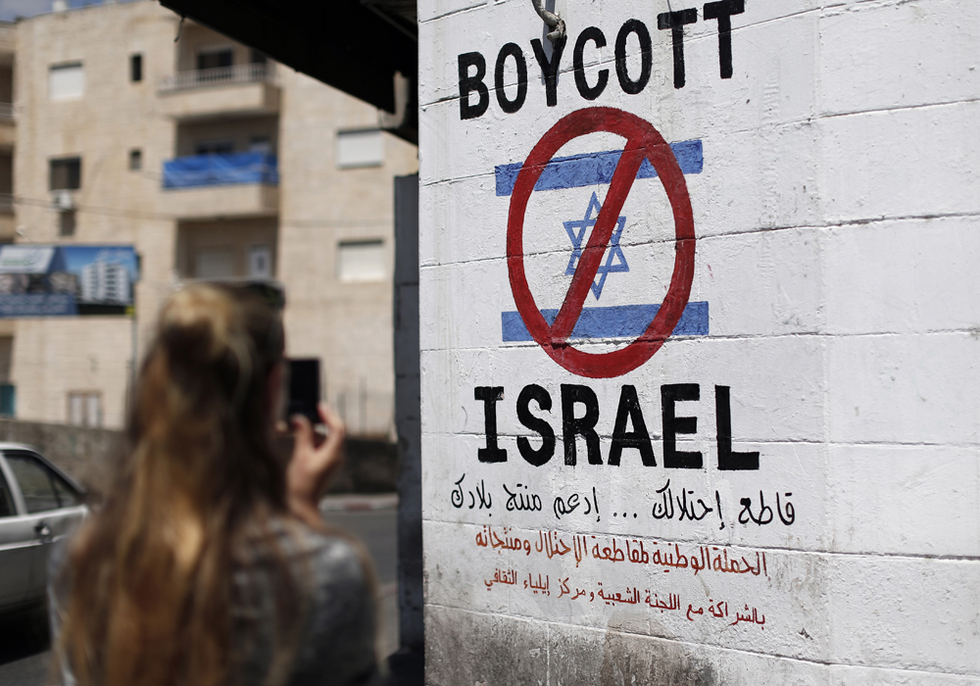 Photograph: A tourist photographs a sign painted on a wall in the West Bank biblical town of Bethlehem on June 5, 2015, calling to boycott Israeli products coming from Jewish settlements (AFP)