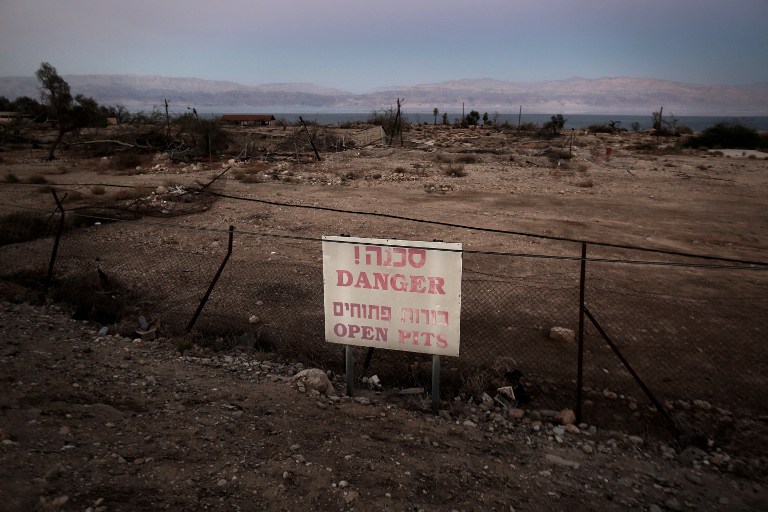 Image: A poster warning visitors of sinkholes in Israel's abandoned tourist resort of Ein Gedi on the shore of the Dead Sea in July 2016 (AFP)
