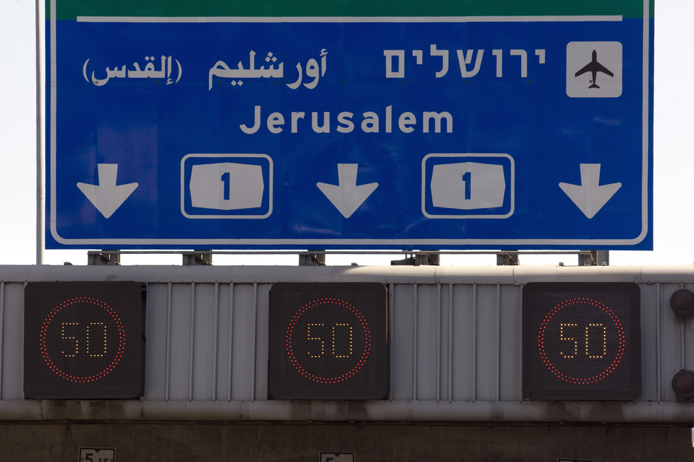 Photo: A road sign reading Jerusalem in English (bottom), Yerushalaim in Hebrew (R) and Yerushalaim written in Arabic script and al-Quds in Arabic (L) is seen in a highway in Tel Aviv on 13 July, 2009 (AFP).