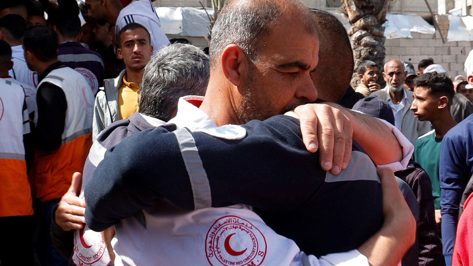Palestinians mourn medics, who came under Israeli fire while on a rescue mission, after their bodies were recovered, according to the Red Crescent, in Khan Younis in the southern Gaza Strip on 31 March, 2025 (Reuters)