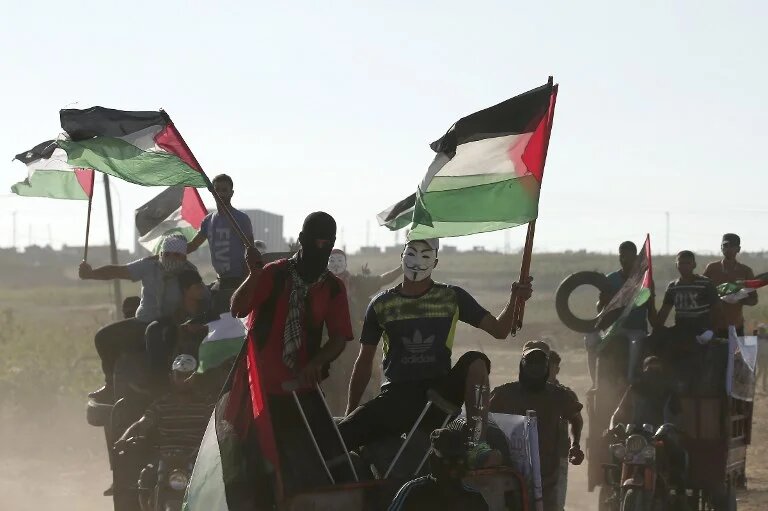 Photo: A Palestinian demonstrator wearing a Guy Fawkes mask holds his national flag during a demonstration in Gaza on 27 July 2018 (AFP)