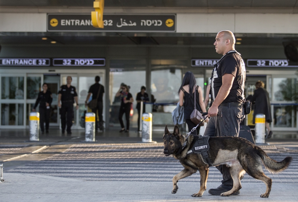 Photo: A security officer leads a dog as they patrol the entrance of Ben Gurion International airport, near the Mediterranean Israeli coastal city of Tel Aviv on 21 August 2014 (AFP)