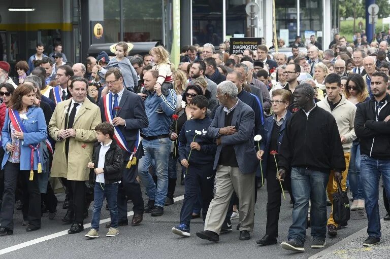 Photo: People and French elected representatives hold flowers as they take part in a march in Mantes-la-Jolie on 18 June 2016, in tribute to French policeman Jean-Baptiste Salvaing and his partner Jessica Schneider who were killed outside their home in Magnanville, by 25-year-old Larossi Abballa, who had pledged allegiance to the Islamic State group (AFP)