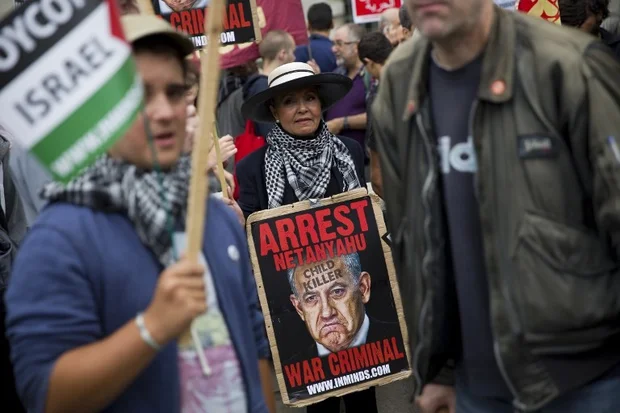 A pro-Palestinian demonstrator carrying a placard depicting Israeli Prime Minister Benjamin Netanyahu joins others during a protest outside the gates of Downing Street in London on 9 September, 2015 (AFP)