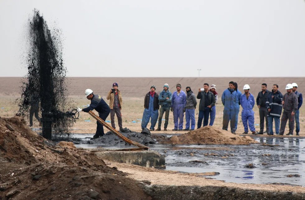 Photo: Workers from the South Oil Company watch on as a pipeline ejects oil, as the company opens two wells in Tuba oilfield West of Iraq's second largest city of Basra on 19 February, 2015 (AFP).