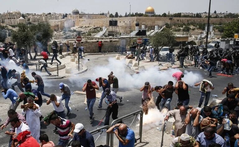 Photo: Palestinian worshippers run for cover from teargas fired by Israeli forces outside Jerusalem's Old City in front of the Al-Aqsa Mosque compound, as tensions rose and protests erupted over new security measures at the holy site on 21 July 2017 (AFP)