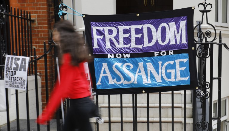 Photo: A pedestrian passes a banner reading ‘Freedom for Assange’ outside the Ecuadorian embassy on 30 July 2018 (AFP)