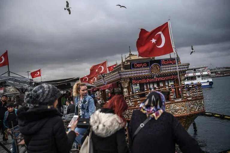Photo: People stay next to fish and bread vendors near the Golden Horn in Istanbul's Eminonu district on 6 November, 2018 (AFP).
