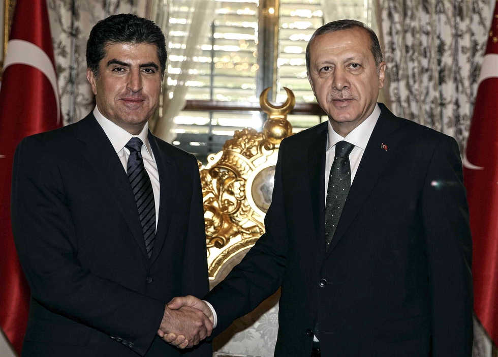 Photo: Turkish President Recep Tayyip Erdogan shaking hand with Prime Minister Nechirvan Barzani (left) of Iraq's Kurdish Regional Government (KRG), in Istanbul in November 2016 (handout/AFP/Turkish presidency)