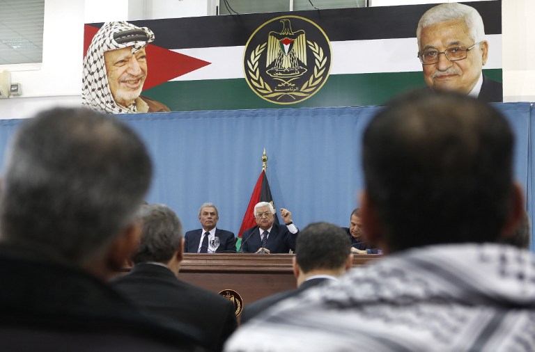 Photo: Palestinian Authority President Mahmud Abbas (C) speaks during a meeting with journalists in the occupied West Bank city of Ramallah, on 23 January, 2016 (AFP).