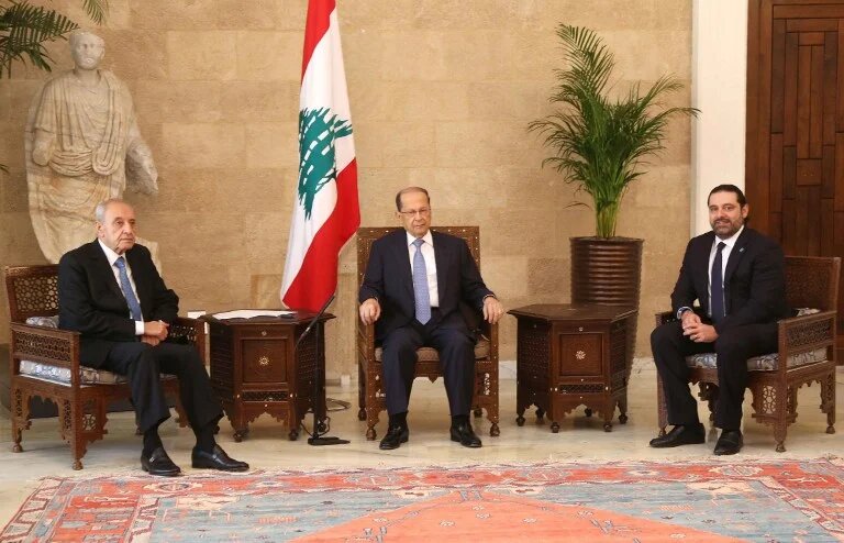 Photo: Lebanese President Michel Aoun (C) meets with his newly appointed Prime Minister Saad Hariri (R) and Parliament Speaker Nabih Berri at the presidential palace in Baabda, east of Beirut on 3 November 2016 (AFP)