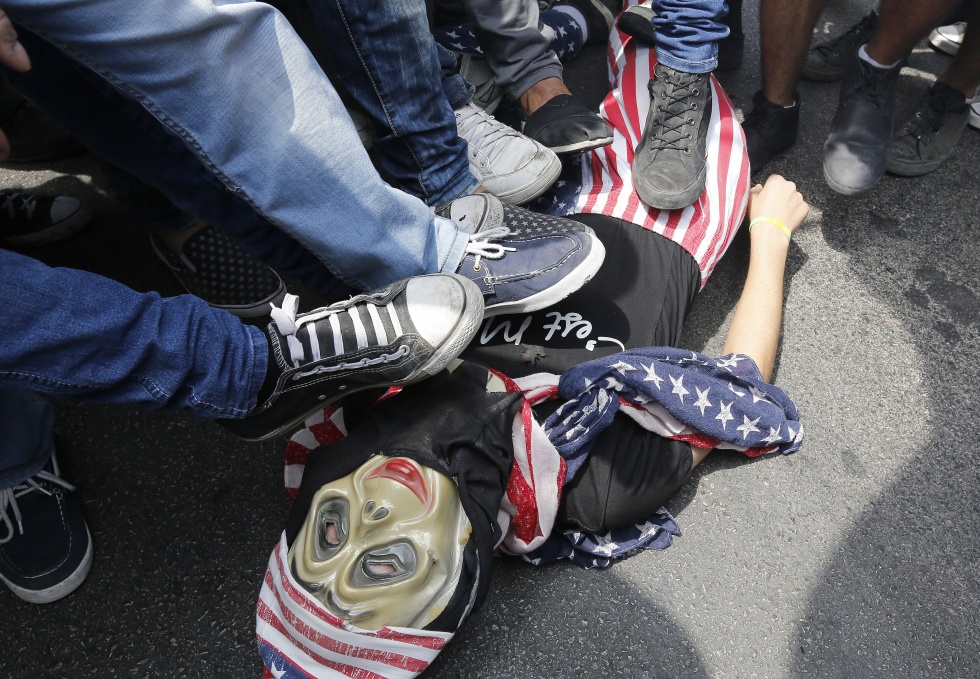 Photo: People pretend to step on a man dressed in the colours of the American Stars and Strips flag, during a protest near the US embassy in Awkar, near the Lebanese capital Beirut, on 20 July, 2014, against the Israeli military offensive on the Gaza Strip (AFP)