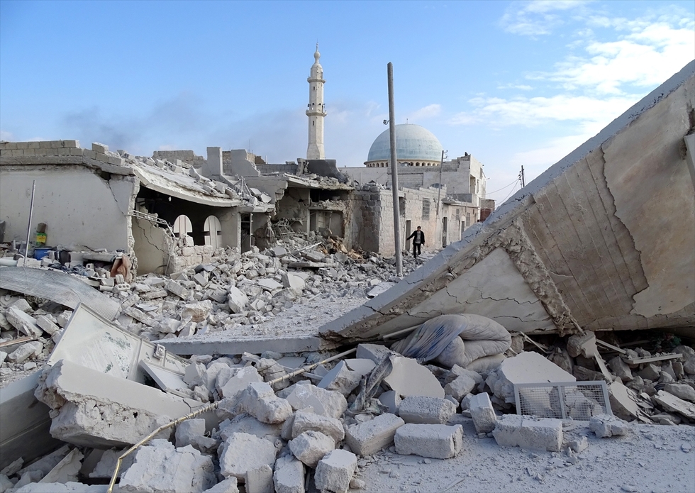 Photo: Collapsed buildings are seen after Russian jet hit residential area at Anadan district of Aleppo, Syria on February 2, 2016. (AA).