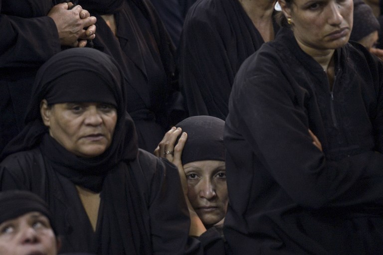 Photo: Relatives of killed Coptic Christians grieve as they gather during the funeral at Abu Garnous Cathedral in the north Minya town of Maghagha in May 2017 (AFP).