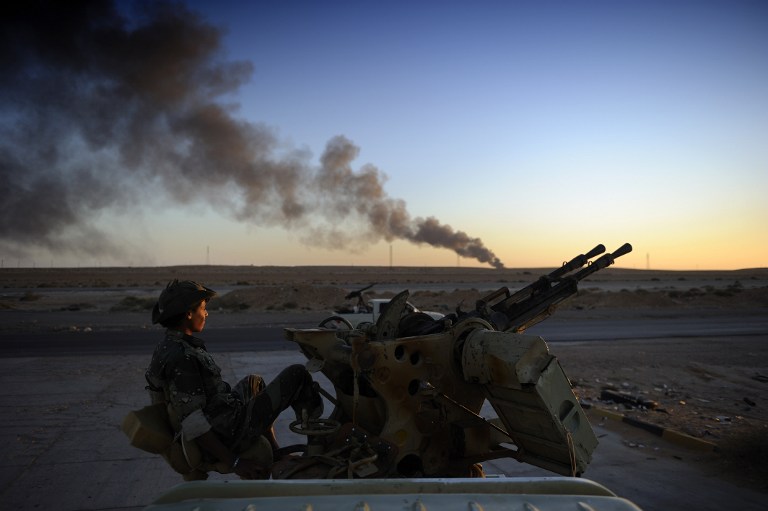 Photo: Smoke pours out from a refinery near Ras Lanuf as a rebel fighter looks on (AFP)