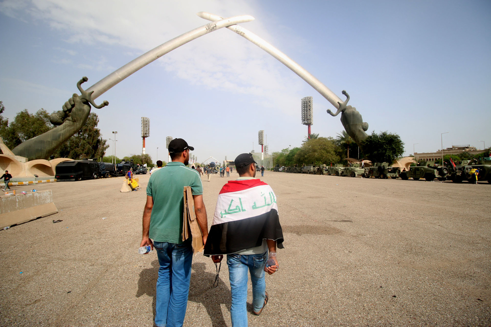 Photo: Iraqi protesters walk towards the "Crossed Swords monument" in Baghdad's heavily fortified "Green Zone" on 1 May, 2016 (AFP).