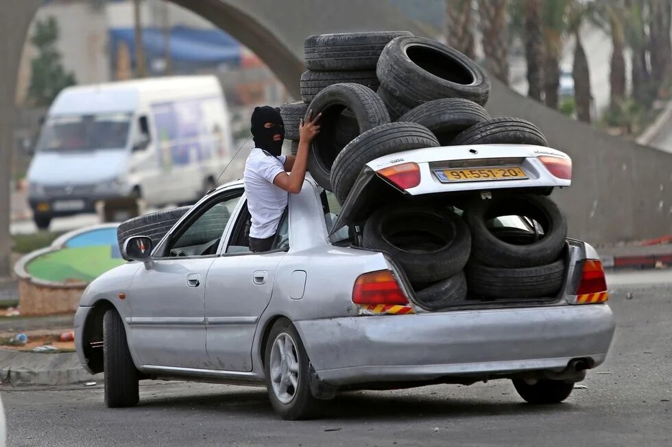 Photo: Tires which will be used to block the roads are seen behind a car at Beit El checkpoint in Ramallah, West Bank on 19 October, 2015 during a protest against the Israeli violations in Jerusalem an West Bank (AA).