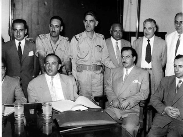 Photo credit: Abd al-Karim Qasim (back row, centre) and other leaders of the 1958 revolution, including Abdul Salam Arif (back row, second from left) and Muhammad Najib ar-Ruba'i (back row, fifth from left). Also included is Ba'athist ideologue Michel Aflaq (front row, first from right). (Wikicommons)