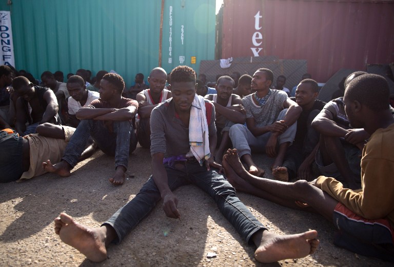 Photo: Migrants at Tripoli Commercial Port before being transported to a detention centre in Tripoli on 22 October 2016 (AFP).
