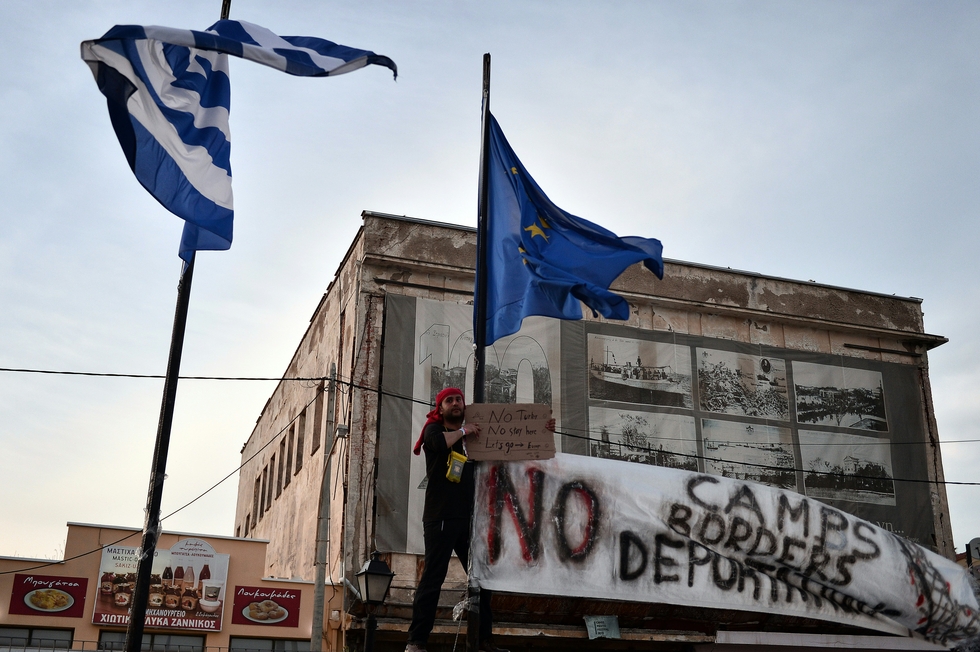 Photo: A refugee from Syria takes part in a protest at the Greek port of Chios where refugees and migrants who broke out from Vial detention center are camping-out on 3 April, 2016 (AFP).