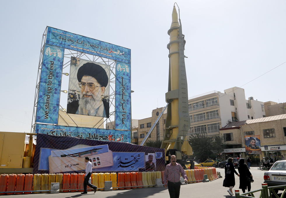 Photo: A Ghadr-F missile is displayed next to a portrait of Iran's Supreme Leader Ayatollah Ali Khamenei at a war exhibition to commemorate the 1980-88 Iran-Iraq war at Baharestan square, south of Tehran on September 26, 2016. (AFP)