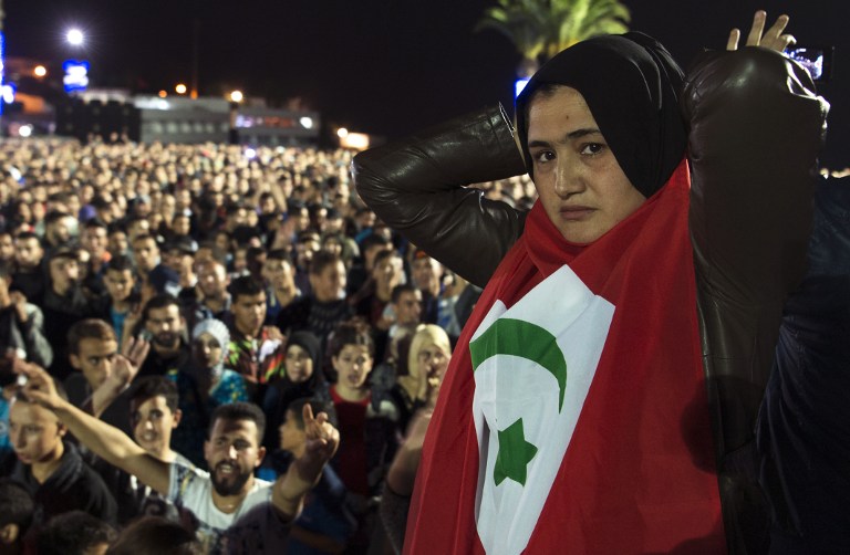 Image: A protester holds the flag of the Rif Republic as protesters shout slogans in the northern city of Al Hoceima on 30 October 2016 following the death of fishmonger Mohsin Fikri, who was crushed to death on 28 October in a rubbish truck in Al Hoceima, as he reportedly tried to protest against a municipal worker seizing and destroying his wares (AFP)